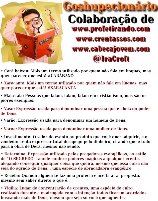 Hoje é quinta feira. É dia de você, querido crente novinho, que não é um Crentassos ou tolinho, que não tem nada a ver com o Cabeça Jovem, abrir os olhos e saber mais um pouco do que rola no meio gospel. Até mesmo você que não é crente, quer entender o que esse povo fala em seus cultos e ministrações assim como a ? Chegou a hora! Mais uma versão, quentinha, do dicionário gospel. O Goshupecionário! =)